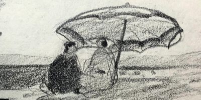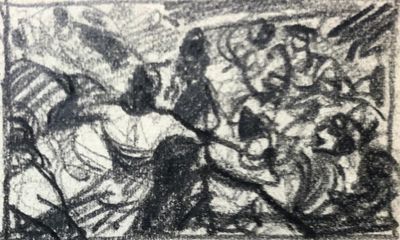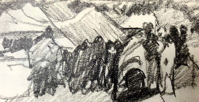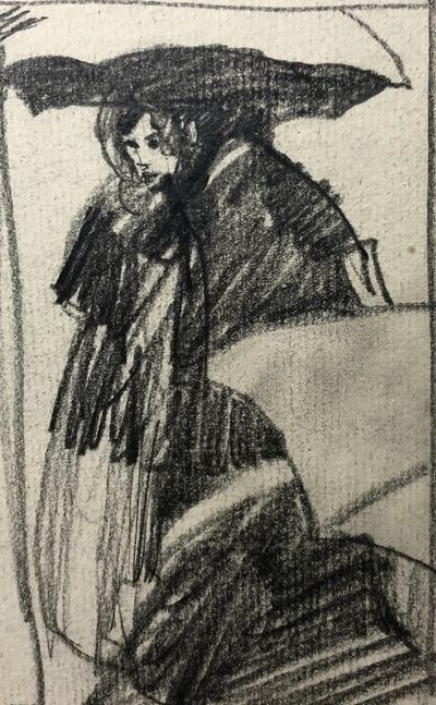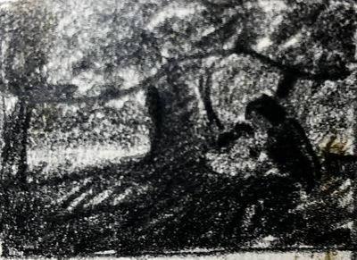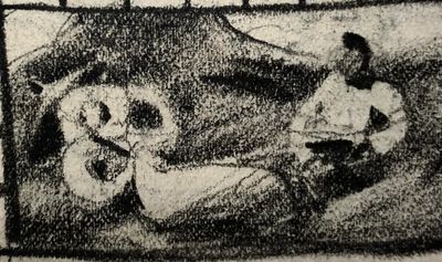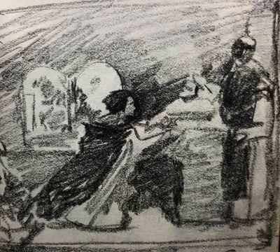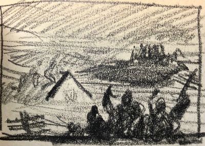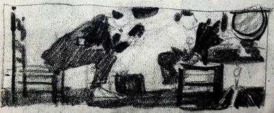 The images in this section are all taken from Andres' student sketchbooks and represent a key part of Dunn's teaching: the thumbnail sketch. Both Dunn and his teacher, Howard Pyle, were firm believers in small gestural compositional sketches made approximately 2x3" called "thumbnails" which they felt contained the essence of the pictorial concept of that painting to be. The thumbnail was the abstract map of the painting and would be transferred carefully in charcoal to the canvas with no intermediate studies.